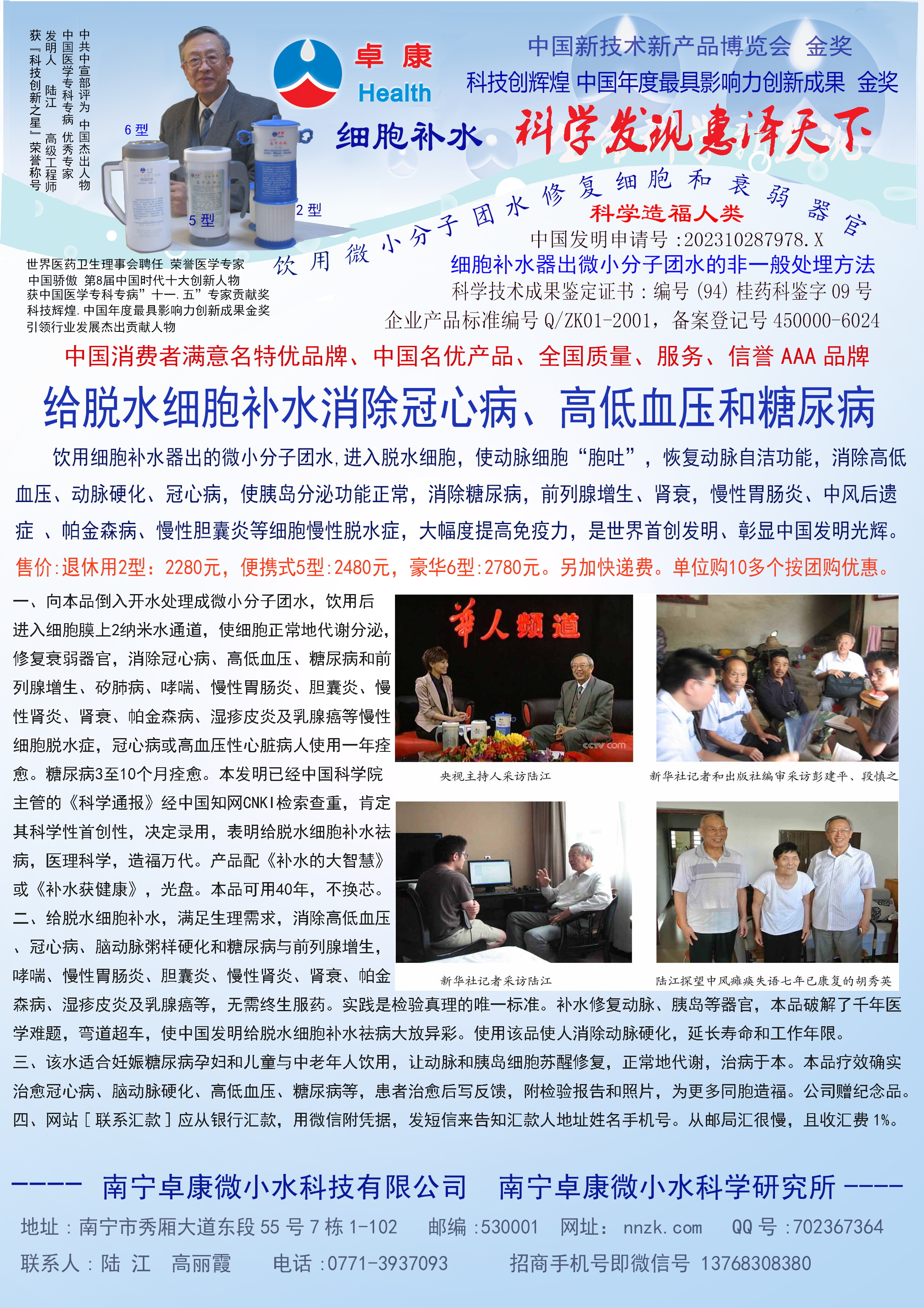 人類幾千年來患以上病癥需終生服藥,幾十年也不能治愈。可是我國南寧的高級工程師陸 江,于1990年想根治高血壓,研究發(fā)明了離子水瓶,處理出微小分子團水供飲用,經(jīng)過醫(yī)院臨床試用和專家鑒定,1999年獲中國發(fā)明專利權,產(chǎn)品于2000年投放市場后一直跟蹤調查,據(jù)全國各地用戶反饋:祛除了高低血壓、糖尿病和冠心病,并使前列腺增生、咽喉炎、鼻竇炎、慢性氣管炎、支氣管炎、矽肺病、哮喘、慢性胃炎、腸炎、慢性膽囊炎、慢性腎炎、腎衰、膀胱炎、便秘、痔瘡、風濕性關節(jié)炎和濕疹皮炎及中風后遺癥等病癥不藥而愈。為什么喝微小水能治20多種病?陸 江從1991年德國科學家發(fā)現(xiàn)細胞膜水通道僅為2納米獲得啟發(fā),認為多種器官患病是因細胞脫水,不能正常代謝和分裂增殖,才使器官細胞減少致衰弱萎縮而形成細胞缺水性病癥。22年來的實踐有力地支持了“細胞脫水致病”這一重要論點,表明喝微小水可滿足細胞的生理需求,補水就能祛病,是生命科學新亮點。